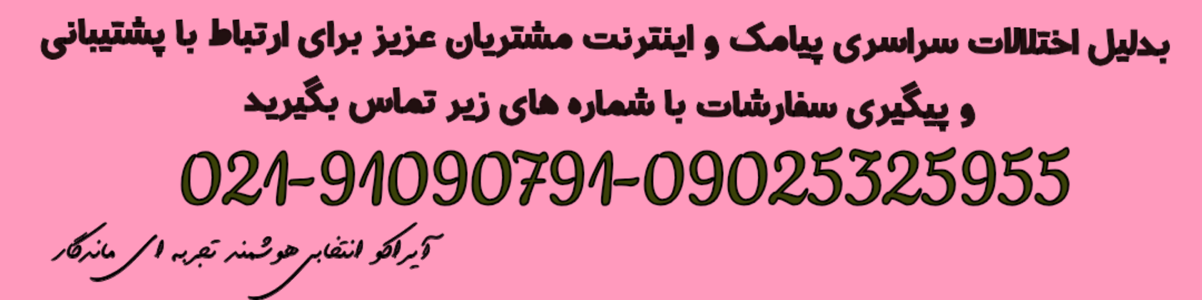بدلیل اختلالات سراسری پیامک و اینترنت مشتریان عزیز برای ارتباط با پشتیبانی و پیگیری سفارشات با شماره های زیر تماس بگیرید09025325955