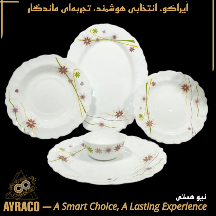 در این سرویس، برخلاف مدلهای ۲۶ پارچه، کاسه سالاد وجود ندارد؛ اما با همین ترکیب هم نیازهای اصلی یک میز غذاخوری کامل را تأمین میکند.