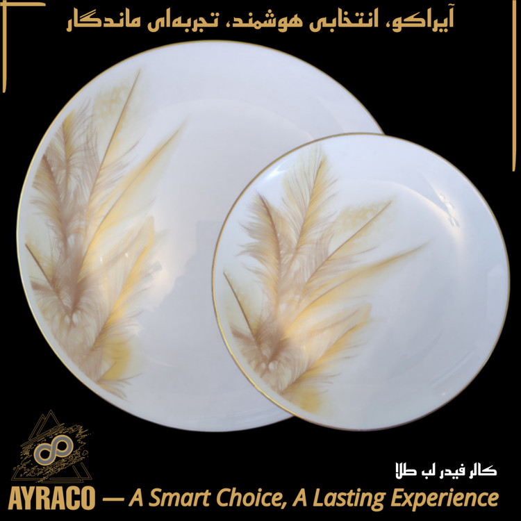 طرح کالرفیدر طلایی با ترکیب رنگ سفید شفاف بدنه آرکوپال و پرهای طلایی براق، حس آرامش و شکوه را به بیننده منتقل میکند. استفاده از طلای واقعی در لبه ظروف باعث شده که این سرویس به یک انتخاب لاکچری برای مهمانیهای رسمی و خاص تبدیل شود.