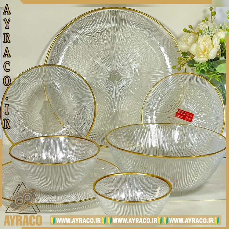 سرویس ۳۳ پارچه بلور نوری تازه مدل سولو لب طلا | مقاوم و نشکن | شش نفره