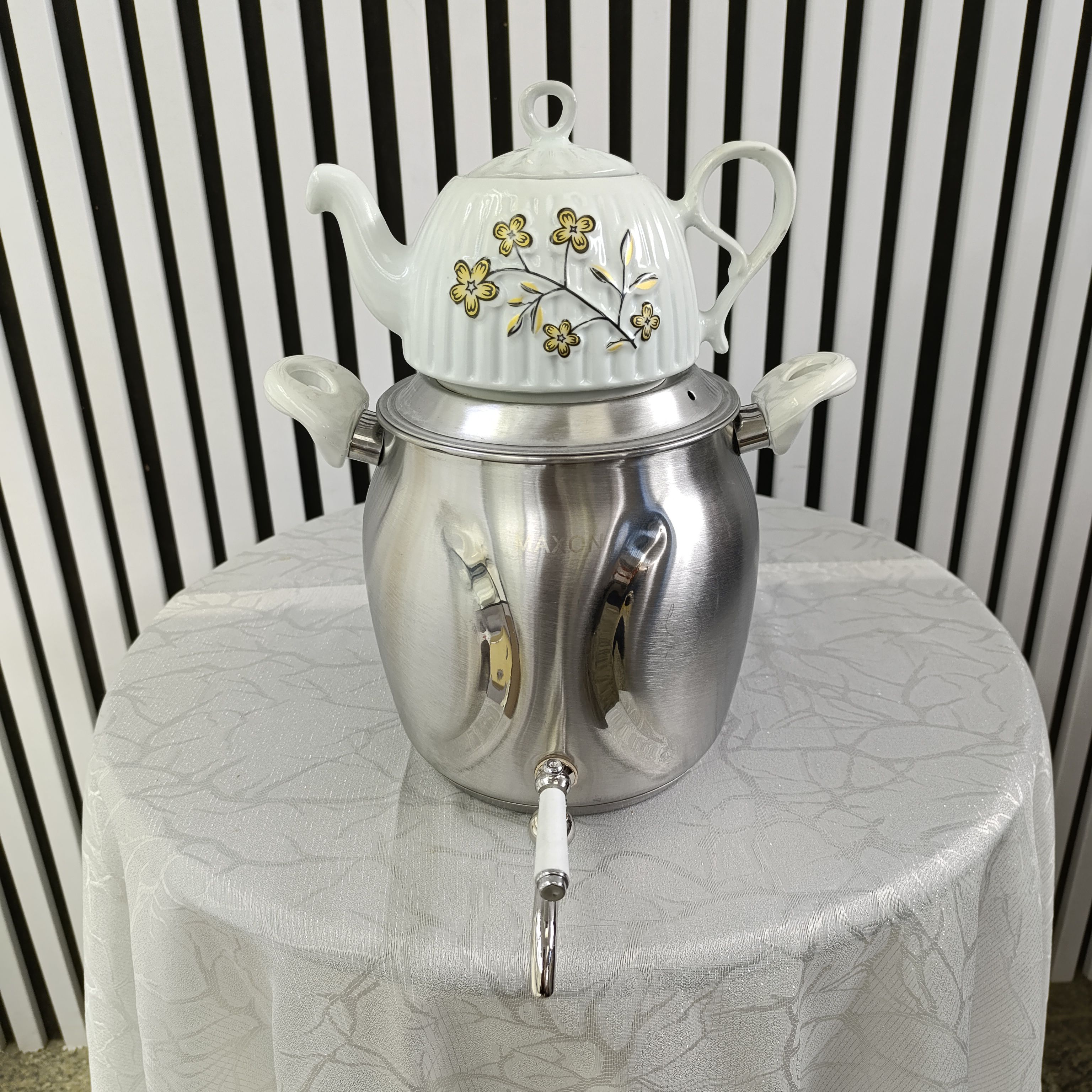 قوری از جنس چینی مقاوم بوده و طعم واقعی و اصیل چای ایرانی را حفظ میکند. ظرفیت کتری ۵ لیتر و ظرفیت قوری ۱ لیتر است که آن را برای خانههای پرجمعیت، محیط کار، مغازه و استفاده روزمره بسیار مناسب میسازد.