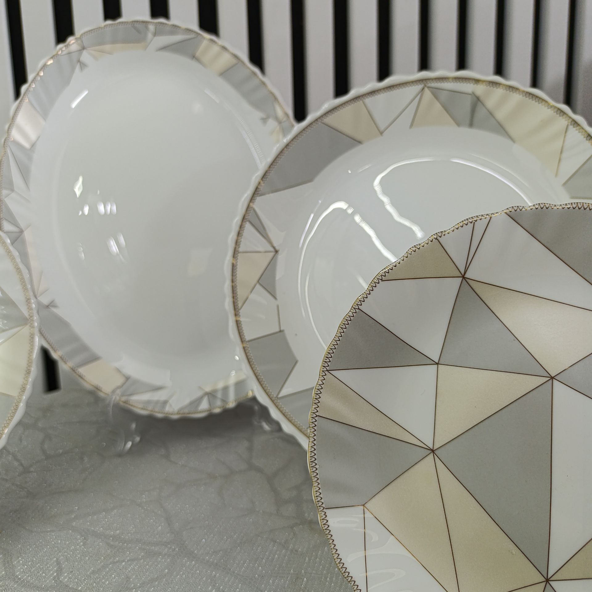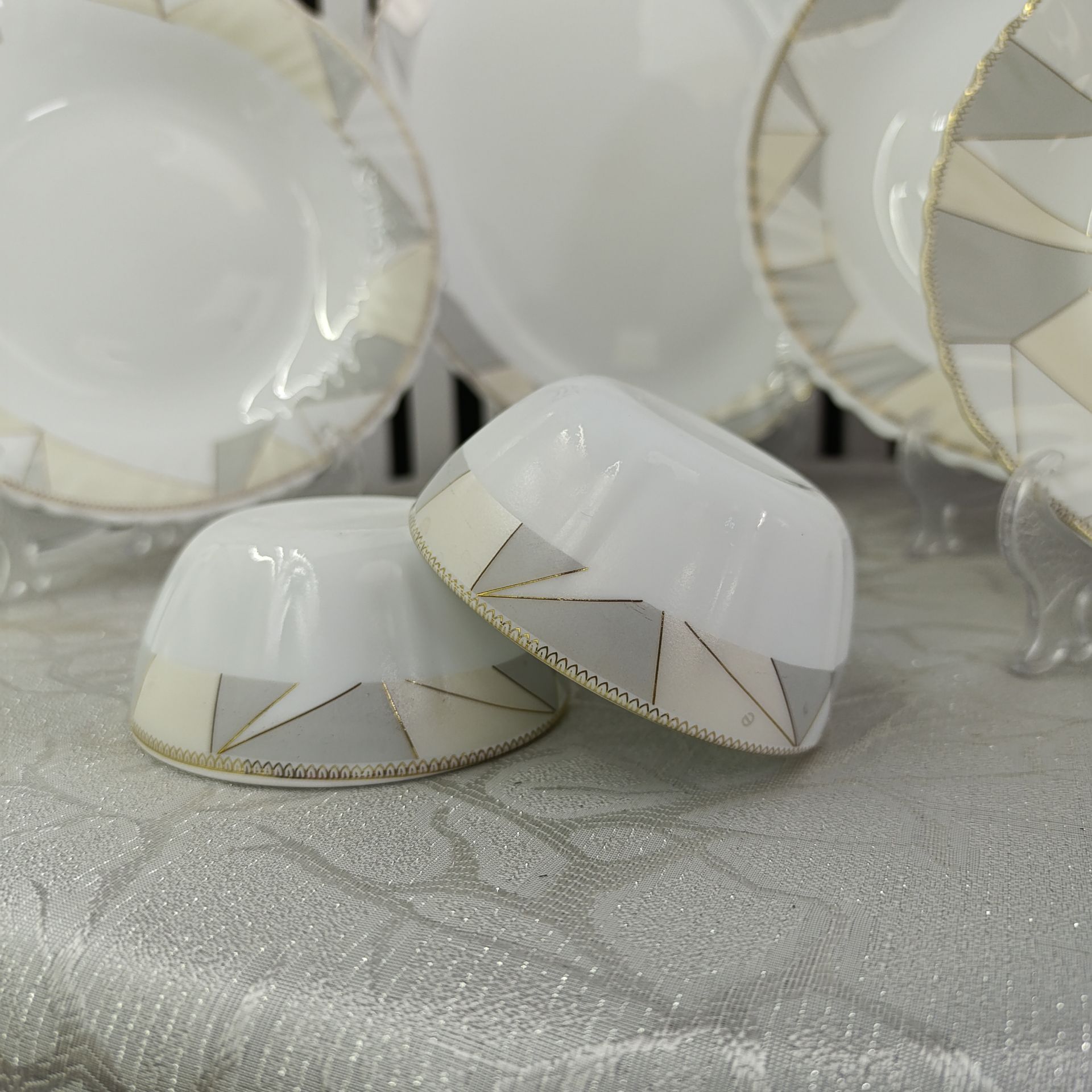 این سرویس از سرامیک یا اکروپال پیشرفته با پوشش طرح شیشهای (Glass-Look) ساخته شده است که احساس وزن و درخشش ظروف کریستال را با مزیت ضدشکستگی و سبکی ظروف مدرن تلفیق کرده است. رنگ طوسی ملایم و خنثی با جلای شیشهای، با هر دکوراسیون و سلیقهای هماهنگ میشود و فضایی الگانت، تمیز و مدرن خلق میکند.